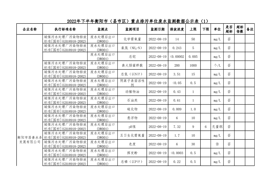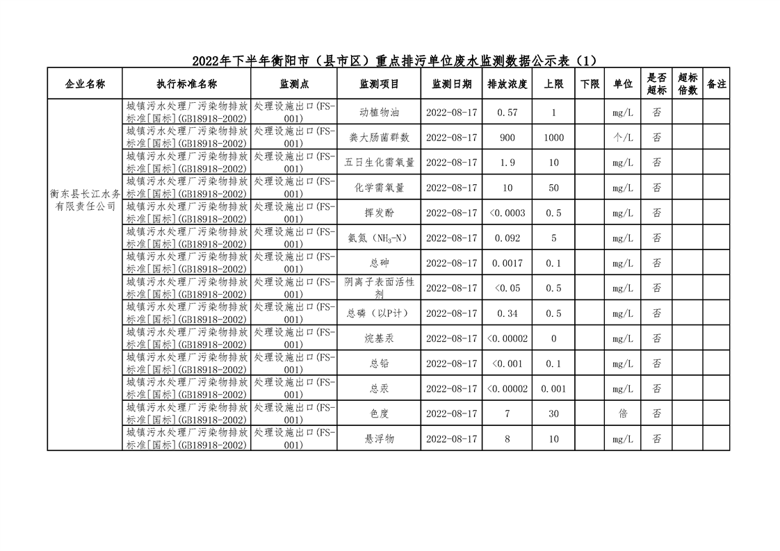 2022年下半年衡陽市(縣市區(qū))重點(diǎn)排污單位廢水執(zhí)法監(jiān)測數(shù)據(jù)公示表(一)